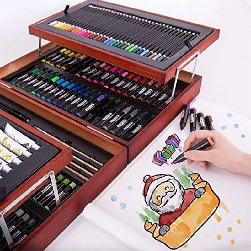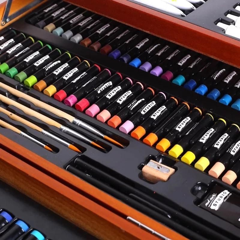 The art set includes: 12 x Acrylic paint 12 x Watercolour paint 12 x Oil paint 54 x Oil pastel 42 x Felt tip marker 34 x Colour pencil 2 x Round brush 2 x Flat brush 1 x Pencil sharpener 1 x 2Bpencil 1 x 4B pencil 1 x Eraser