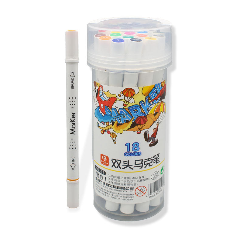 18 Double side Fine & Broad Marker Colors with Color codes. Best marker colors for kids to have in their stationery. One side of the marker is like a fine marker and other side is a Broad marker side.
