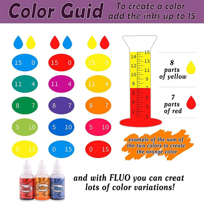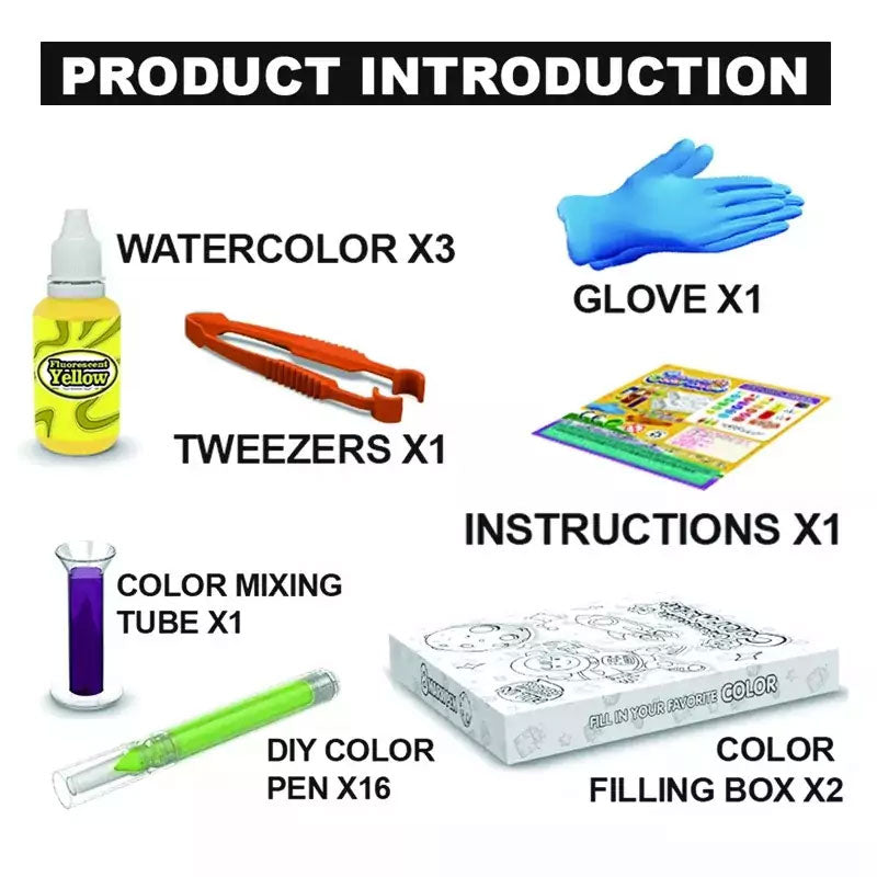 Product Information: Watercolor x3, Glove x1, Instruction x1, Tweezers x1, Color Mixing Tube x1, DIY Color Pen x16, Color Filling Box x2.