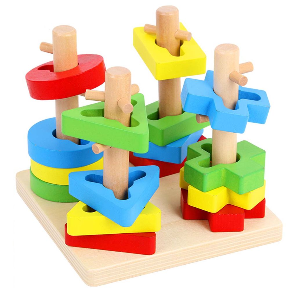 This is New Four Column Wooden Frame with different shapes and different Frame Sticks children will learn about shapes, and color, and play with a sort of puzzle when they have to Drop out the pieces, and the thinking ability of your child will also be enhanced.