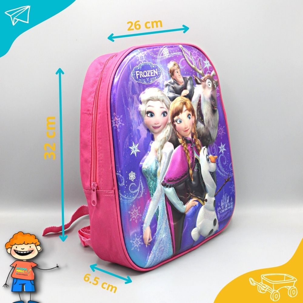 Frozen backpack for children to carry their books, stationary and other learning things. It has Characters of Animated Movie Frozen in 3D Hard Plastic form on the front side of the bag.