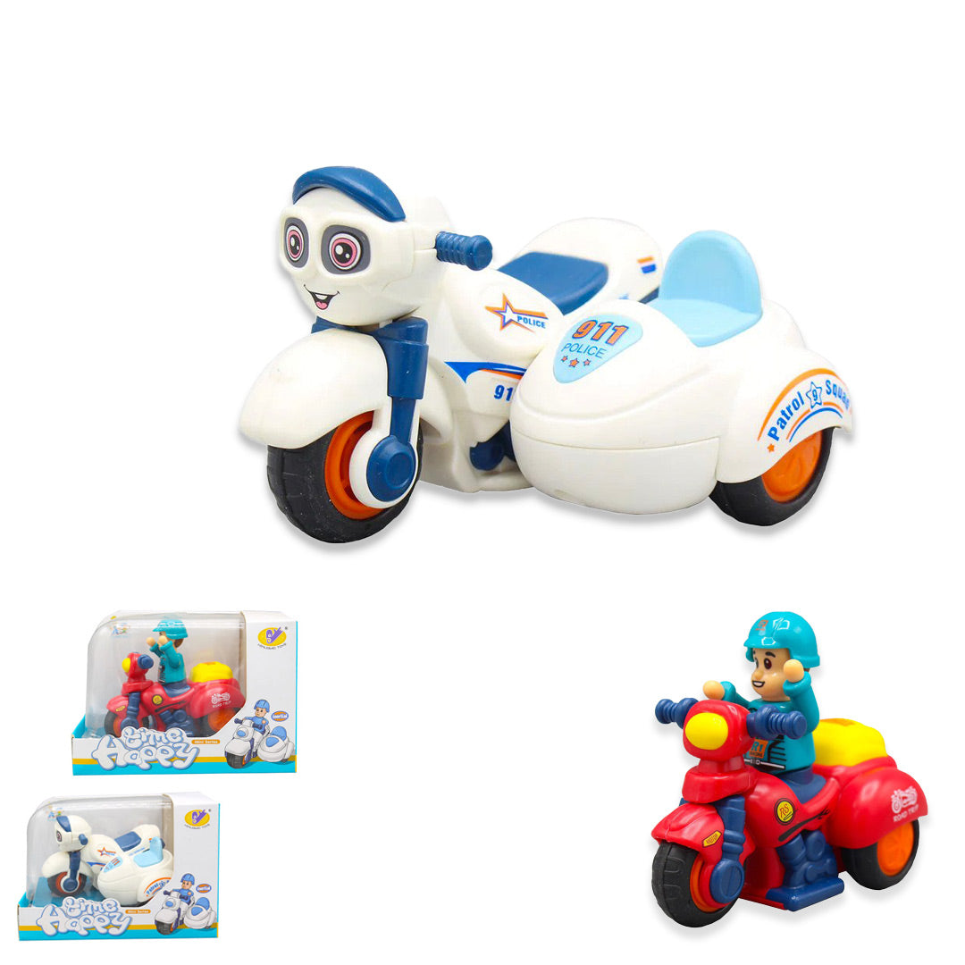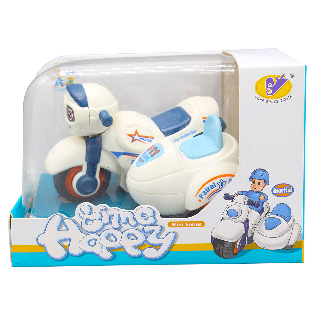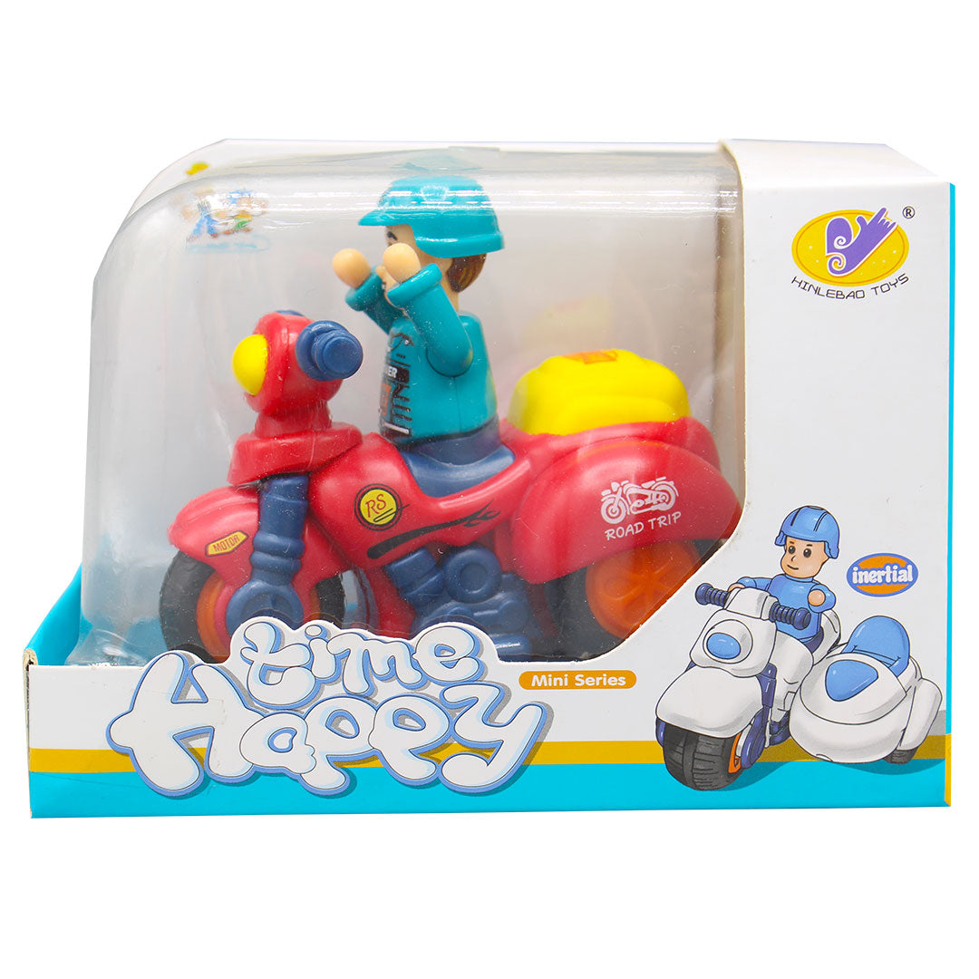 New Happy time Inertia bikes for kids to play with. This mini bike series is made up of environment-friendly material for the safety of children. Useful for kids' brain color recognition ability. Kids will do chase exercises for it. There is a red bike having a man riding on it. The other one is the scooter having a sidecar with it. These two scooters have two colors whit and blue.